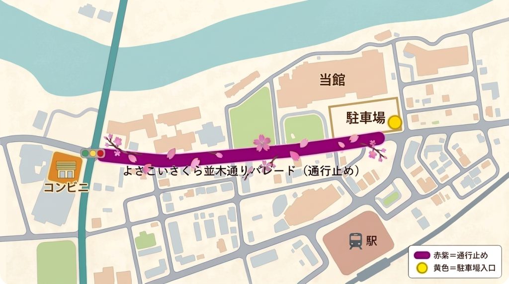 桜並木通りでのパレード開催に伴い、下記の通り一部通行止めとなる時間帯がございますのでご注意ください。